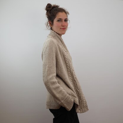 JOEL is worked seamlessly from the top down. It starts with a provisional cast on for the shawl collar from which you pick up stitches for the neckline shaping. Shoulders are shaped by using the contiguous method. When shoulder shaping is done, increases for sleeves and front shaping will be worked parallel. After sleeve dividing it is just going on straight on.
