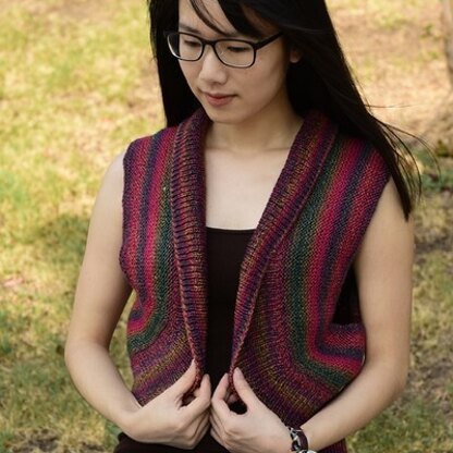 Jojoland Diagonal Matrix is a beautiful, colorful vest that's knit from the top down with a wide garter stitch collar border. Jojoland Rhythm Superwash features long color repeats that highlight the knitting directions of this vest. Diagonal Matrix begins at the top of the back and continues down to the underarm level where stitches are cast on for the sides and fronts of the vest. the Back and fronts are seamed at the shoulder and the garter border completes the garment.