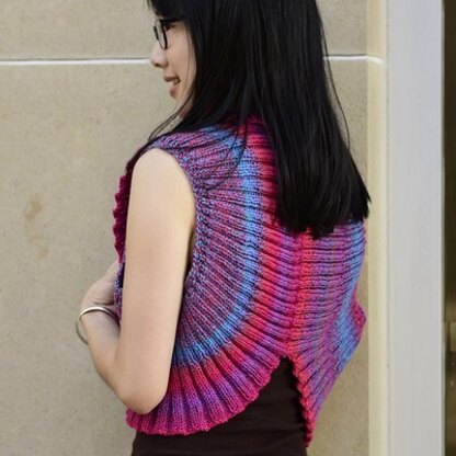The stylish Jojoland Rings Around Rosie vest is made of two identical circles worked in the round and seamed at the back. Rings Around Rosie is such an easy knit you will want to make several! The design is visually interesting from the back as well as the front. Wear it open or close it with a pin, turn the edge back to form a collar, or wear it flat—the possibilities are endless!