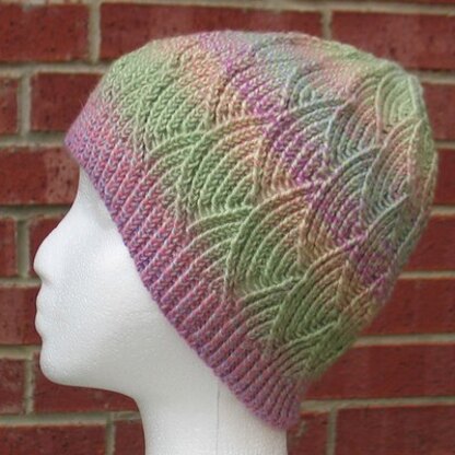 Jojoland Water Lily hat is knit in the round from the ribbing to the crown in a lovely ripple stitch reminiscent of fish scales or waves. Jojoland Rhythm Superwash is used to make this colorful, fun hat and adds its beautiful color changes to the project. Stitch pattern is both charted and written out.