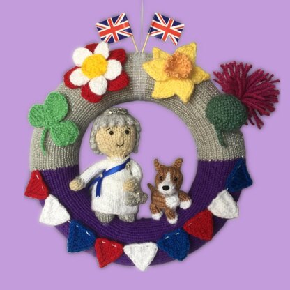 In 2022, Her Majesty Queen Elizabeth II became the first British Monarch to celebrate a Platinum Jubilee, 70 years of service. This knitted wreath celebrated the occasion, decorated with bunting flags, and the national flowers of the four nations: English rose, Welsh daffodil, Scottish thistle and Northern Irish shamrock. Use elements from the wreath to make future jubilee memorabilia such as brooches and hairbands.