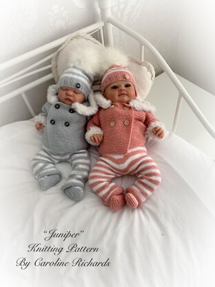 This knitting pattern provides the instructions to make this beautiful fur hooded double breasted modern jacket, pants, bobble hat and booties. The hooded jacket is knitted from the top down on straight needles. The pattern provides easy step by step instructions.