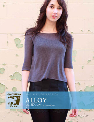 Alloy from Juniper Moon Farm is a beautiful, lightweight pullover with a lovely lace panel on the back. Juniper Moon Farm Findley is used to knit this top-down sweater with three-quarter sleeves. Juniper Moon Findley a gorgeous laceweight yarn in a blend of 50% Merino, and 50% silk. The lace pattern is in written form only.