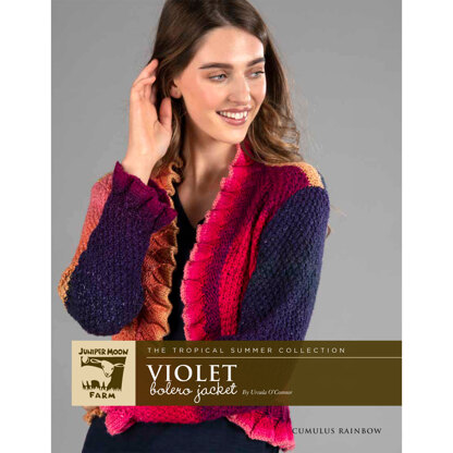 Juniper Moon Farm Violet Bolero Jacket is a striking women’s bolero-style cardigan with an enthusiastic bell edging knit in Cumulus Rainbow. The body and the sleeves of this piece are worked in a double moss stitch pattern. Violet Bolero Jacket is knit flat in pieces and then seamed. The amazing softness of Cumulus Rainbow from Juniper Moon Farm has to be felt to be believed! Cumulus Rainbow is the same cloud-like worsted weight, chainette constructed yarn as Cumulus, now in self-striping cakes. The bell edging is in written form only.