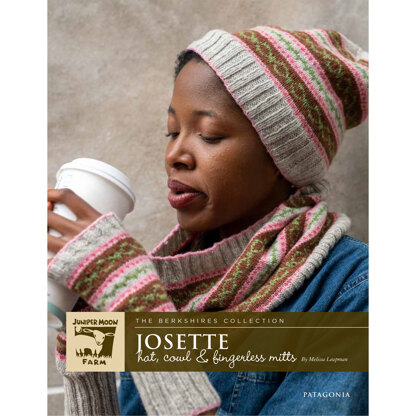 Juniper Moon Farm’s Josette is a stunning Fair Isle set knit in Patagonia. The set showcases a hat, cowl, and fingerless mitts with a lovely, easy colorwork pattern. These pieces are knit in the round from the bottom up seamlessly. Patagonia Organic Merino is going to be your new favorite wool! Juniper Moon Farm creates gorgeously heathered colors in a 2-ply DK weight that will produce cables that stand tall and offer crisp colorwork lines. This 100% organic wool is perfect for the eco-conscious and those with chemical sensitivities.
