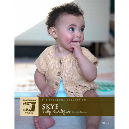 Juniper Moon Farm Skye is a gorgeous short-sleeve baby’s cardigan knit in Nimbus. The sweater is knit from the top-down with raglan short sleeves and a lovely lace pattern on the bottom half of the cardigan. Nimbus takes the pillowy soft Cumulus from Juniper Moon Farm and dials up the squish factor to arrive at this delightful bulky weight. With a plush combination of Mako cotton and a hint of nylon for strength, this chainette yarn will make quick work of knit or crochet garments and accessories. The lace pattern is in chart form only.