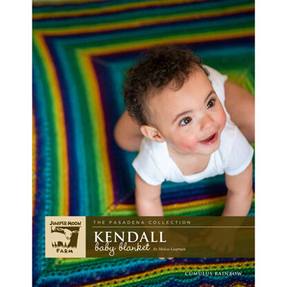 Juniper Moon Farm Kendall is a stunning and colorful baby’s blanket knit in Cumulus Rainbow. The throw is knit in the round from the center out. The body of the blanket is in a garter ridge pattern, then switched to the Blossom pattern, followed by several more rows of garter ridge pattern, then finished with a lovely lace border pattern. This blanket is sure to be passed down and enjoyed! The amazing softness of Cumulus Rainbow from Juniper Moon Farm has to be felt to be believed! Cumulus Rainbow is the same cloud-like worsted weight, chainette constructed yarn as Cumulus, now in self-striping cakes. The Blossom and the lace border patterns are in chart form only.