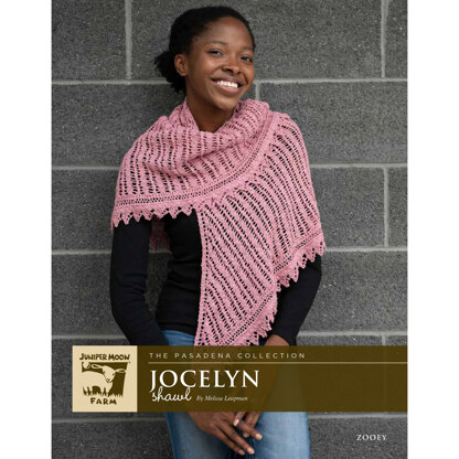 Juniper Moon Farm Jocelyn is a lovely lace women’s shawl knit in Zooey. The wrap is knit from the top-down, beginning with a stockinette stitch tab. A center lace panel runs down the center back and then finishes with a knit-on lace edging. Juniper Moon Farm Zooey is a soft blend of cotton and linen with a slightly thick & thin texture. The lace pattern is in chart form only.