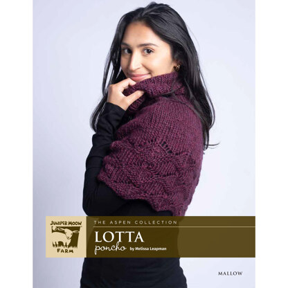 Juniper Moon Farm Lotta is a lovely women’s poncho knit in Mallow. The accessory features a k1, p1 rib turtleneck, and a lace openwork pattern. Lotta is worked in the round from the bottom up, starting with the lace pattern and finishing with the turtleneck. Juniper Moon Farms Mallow is an airy and light bulky-weight yarn. This yarn is gently spun and held together with a strand of thread. The lace pattern is in written form only.