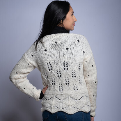 Abigail from Juniper Moon Farm is a lovely women’s lace cardigan knit in Mallow. The sweater features a crew neckline, dropped shoulders, and long sleeves with a simple eyelet and lace pattern. The cardigan is finished with knitted buttons. Abigail is knit flat in pieces from the bottom up and then seamed. Juniper Moon Farms Mallow is an airy and light bulky-weight yarn. This yarn is gently spun and held together with a strand of thread. The lace pattern is in chart form only. The lace patterns are in chart form only.