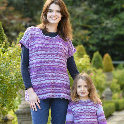 Juniper Moon Farm Vienna is a colorful lace project with options for a roomy top or crewneck sweater both included in the pattern. Sizes range from toddler to adult, making it easy to create coordinating sets across a variety of sizes. Vienna is knit flat in pieces from the bottom up and seamed with a scalloping lace pattern alternating with multicolor garter stitch stripes for a fun and vibrant finished project. Zooey and Zooey Stripes coordinate beautifully in this design, adding depth and interest from two solid colors of Zooey and one colorway of Zooey Stripes. Both yarns blend cotton and linen into a warm-weather friendly yarn that wears well and keeps you comfortable. Stitch patterns are written out only.