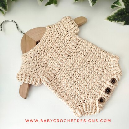 This cute romper is made from the top down then joining the yarn to make the crotch and short sleeves, it works up lovely and cosy.