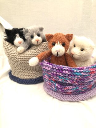 The bag can be used to carry Kala around and then the sides are rolled down to create a lovely cosy bed. Kala measures 10 inches/26cm from head to toe. The feet, legs and body are knitted in one piece, flat and seamed at assembly. The head, arms, ears and tail are knitted separately and attached. I have included a detailed step-by-step assembly guide to help you create a perfect kitten. It is a good idea to just print the directions for the kitten and basket, view the assembly guide on screen to save your printer’s ink and paper.