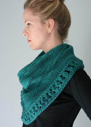 Kallisti (most beautiful, a title of Artemis) is a huntress-inspired shawl-cowl hybrid. Part shawl, part cowl, part semi-circle, part triangle, Kallisti begins as a flat semi-circular shawl, but is soon after joined to work in the round and its shaping is switched to form a triangle. The resulting piece is a cowl that drapes nicely around the neck and resembles a wrapped shawl with large-scale bobbles along the border. In bulky weight yarn, Kallisti knits up very quickly, and is easily adapted if you’d like more (or less) length or circumference to cover you as you aim your arrow.