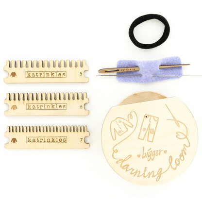 The Bigger Darning Loom from Katrinkles is a helpful tool to help your handmade and store bought items last longer. Patch a hole or strengthen worn spot in sweaters, socks, pants, and any other garment that needs it! The Bigger Darning Loom is perfect for using visible mending to patch worn-through knees and elbows. Three different heddles are included with the Bigger Darning Loom, giving you lots of versatility in the thickness of your mending thread or yarn