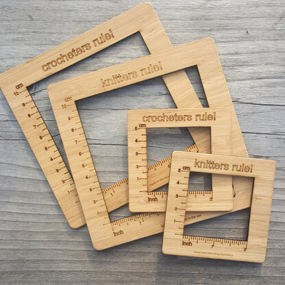 The handy little square Gauge Swatch Measurement Ruler Tool from Katrinkles is used for measuring gauge swatches made from any type of yarn. Simply hold the tool up against your work and count how many stitches fit inside the cut out square (along the bottom for stitch gauge and up the side for row gauge). The bottom measurements are in inches and centimeters are marked on the left side, making this ruler universal for all fiber artists. Choose "knitters rule" or "crocheters rule"! Both styles of tool can be used for either craft. Note: Each Gauge Swatch Measurement Ruler Tool is sold separately.