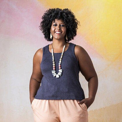 Kelbourne Woolens Desert Queen is a woman’s sleeveless pullover with A-line shaping and eyelet pattern on the front yoke. This knitting pattern is sure to please as it is worked from the bottom up in pieces and uses Kelbourne Woolens Mojave, a lightweight blend of Pima cotton and linen that is loosely plied to create a strong yarn with fantastic stitch definition. The eyelet pattern is in charted form only.