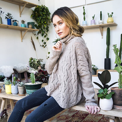 Kelbourne Woolens Sawyer is an oversized boxy pullover that is worked flat in pieces from the bottom up. The lace pattern is fun and relatively easy to remember. After completing the front and back, stitches are joined at the shoulder using a 3-Needle Bind Off. Stitches are then picked up to work a deep ribbed turtleneck. Stitches are picked up at the armholes and sleeves are worked flat in stockinette stitch to the ribbed cuffs. Almost no seaming. Knit in Kelbourne Woolens Scout a gorgeous 2-ply heathered yarn that yearns for hook and needle to create classic designs.It is fantastic for textured stitches or cable work. The Flame Chevron Lace pattern is charted only.