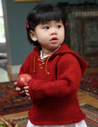 A splendid all season classic design from mac & me. At 4 sts to the inch, this hooded sweatshirt has great chunky proportions. Fun little design details such as a slight bell to the sleeves, fitting at the waist and front lacing make this design awesome under a little down vest or cuddly all by itself.