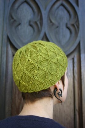 The slipped and twisted stitches in the Bas Relief Hat pattern by Kira K Designs form a tessellated design of pointed ovals that smartly nestle together. The stitch pattern is relatively simple and easy to follow but makes the hat an impressive gift. Choose a smooth, solid/semi-solid colored yarn to highlight the raised stitch pattern. The cable pattern is charted and written out.