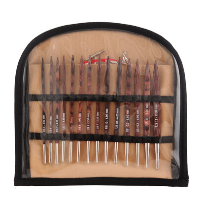 Knitter's Pride Cubics Interchangeable Deluxe Set features needle tips that have a cuboid shape in the body of the needle that gradually gives way to perfectly tapered birch wood points. The ergonomic shape is comfortable to hold, lessens the need to grip tightly, and yields uniform stitch formation. The smooth laminated Symfonie Rose wood has a rich tone, yet it is also lightweight, strong, flexible, and warm to the touch. Needle size is measured diagonally and fits into standard needle sizer just like round needles.