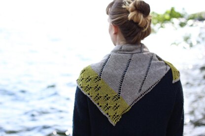 Lakelet is a shawlette inspired by sitting on a lake-side dock, watching the sun come up. The shawl begins at the corner with just a few stitches, and grows across the width of the shawlette until you finally reach a lace edging, which is worked with a small amount of contrasting yarn in a colour the shade of a cloud at sunrise. Easily made larger or smaller, the original was made with 110g of Kettle Yarn Co. Beyul yarn in the yurt colourway and 25g of Beyul in the Steppe colourway.