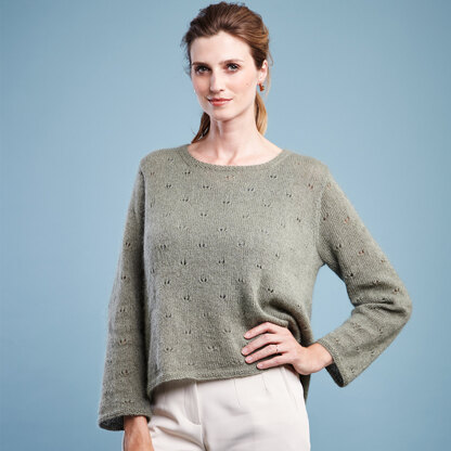 lace pattern and a decorative button closure on the back. The pullover is knit