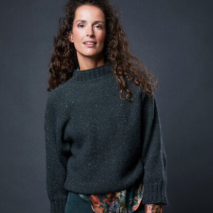 loose-fitting dolman sleeves and a funnel neck knit with one strand of Premia