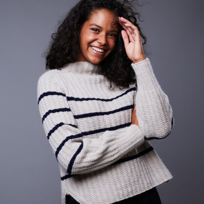 LAMANA 11/05 Brest Pullover is a fun and casual women’s striped pullover knit in Bergamo. The sweater showcases a mock turtleneck, set-in long sleeves seamlessly worked from the top down. Bergamo from LAMANA is a worsted spun and carded wool that makes a lightweight, lofty yarn that’s still incredibly soft and warm. This unique process sorts out short fibers creating stronger uniformity in the fibers that leaves you with a fabric that is durable and less likely to pill.