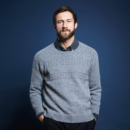 with guernsey patterns on the top of the sleeves and the yoke. The pullover is