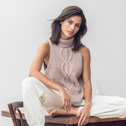 Lana Grossa Top in Tre Seta is a stunning loose-fitting women’s pullover with a lovely cable panel up the center front on a background of moss stitch and checkboard cables. The top is knit flat in pieces and then seamed. The turtleneck stitches are picked up around the neck edging and knit in the round. Lana Grossa Tre Seta is a beautiful 3-ply yarn that has a unique fiber blend sure to create dynamite projects. Its blend of wool, silk, alpaca, and viscose gives this worsted weight yarn softness, sheen, and drape. The cable patterns are in chart form only.