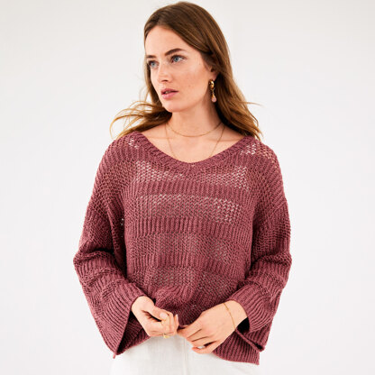 Lana Grossa Pullover in Linarte is a stunning women’s v-neck pullover with textured stripes perfect over a lacy camisole and jeans or a summer dress. The sweater features long, wide sleeves and dropped shoulders. The pullover is knit flat in pieces from the bottom up and then seamed. The neckband stitches are picked up along the neck edge and worked in the round. Lana Grossa Linarte is a DK weight chainette yarn with a silky touch and a gentle sheen. Ideal for textured stitches in your warm-weather garments. The lace patterns are in chart form only.