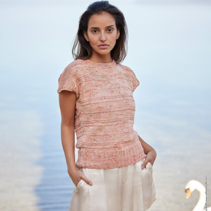 The Lana Grossa Top in Setacotone Hand Dyed is a an easy choice for a go-to piece in your summer wardrobe. This drop-shoulder top features horizontal braid details that elevate the simple shape and dress up the stockinette background. Setacotone Hand Dyed takes a soft blend of silk and cotton and adds hand-dyed colorways from subtle speckles to bold variegateds for extra interest and color in your finished projects. Top is knit flat in pieces from the bottom up and seamed at the sides with a three-needle bind-off joining the shoulders. A crochet edging at the armholes and horizontal braid sequence at the neckline give tidy finishing touches to this cool and comfortable summer top.