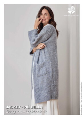 Lana Grossa Jacket in Più Bella is a lovely longline women’s sweater perfect for throwing on over your jeans and a tee top for running errands or over a dress for a night on the town. The sweater is knit flat in pieces from the bottom up with a fabulous textured pattern at the hem, pocket edge, cuffs, and across the shoulders and then seamed. Più Bella from Lana Grossa is a lighter than air yarn! This soft and fluffy yarn is available in great colors; you can use it repeatedly and never get bored!