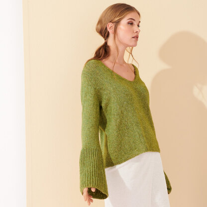 Grossa Pullover in Ecopuno is a v-neck women’s pullover with rib stitch bell