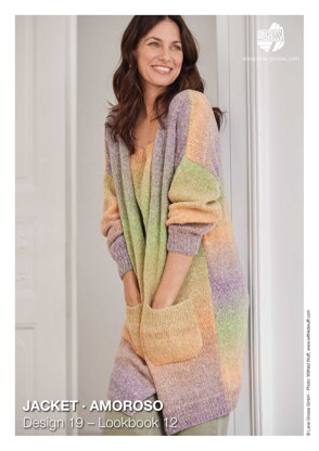 Lana Grossa Jacket in Amoroso is a fun and easy women’s longline cardigan featuring an open-front v-neck, patch pockets, and dropped shoulders. This jacket is the simple staple sweater you need in your closet. This piece is knit flat in pieces from the bottom up and then seamed. Make the matching sleeveless tank by purchasing the pattern separately. Lana Grossa Amoroso is a wool blend yarn that features a beautiful palette of heathered, self-striping colorways. This machine-washable worsted weight yarn has a chainette construction with a lightweight feel and an excellent drape.