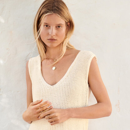 Lana Grossa Top in Alta Moda Cotolana is a lovely women’s tank top with long lines for a feminine, flattering fit that features a sleeveless, deep v-neck, and split front hem that you’ll