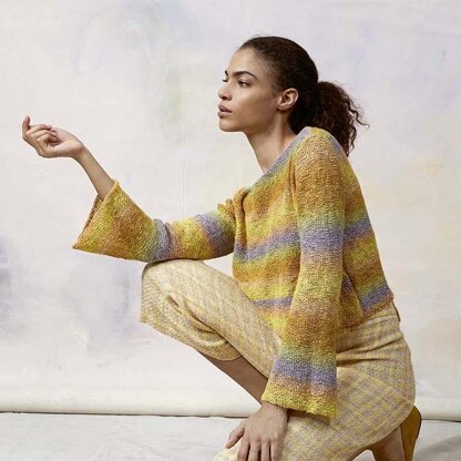 Yarn Requirements: 3 (4, 4, 5) balls Lang Linello (40% Linen/ 32% Cotton/ 28% Viscose; 100g/306yds) shown in 50 Yellows, Light Purples