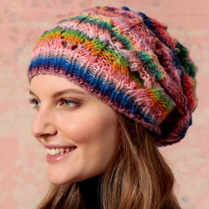 Lang PTO31-07 Hat is a fabulous and quick project for a lace women’s hat knit in Cloud. The hat is knit flat in one piece from the bottom up and then seamed. Cloud by Lang Yarns is a light and airy bulky weight yarn. The colorful striping gives any garment a wow factor that looks impressive. Cloud comes in a generous 284 yards per 100 gram means you’ll have fewer ends to weave in at the end of this project! The cable pattern is in chart form only.