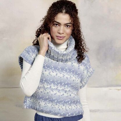 a turtleneck and sleeveless dropped shoulders. This sweater is knit flat in