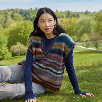 Lang PTO45-01 Vest is a lovely addition to your fall and winter wardrobe knit in Cloud. This oversized women’s vest features a deep v-neckline perfect for layering over a turtleneck or your favorite tee and is knit flat in pieces from the bottom up and then seamed. The neckband and armhole edging stitches are picked up and worked in the round. Cloud by Lang Yarns is a light, airy, bulky, blown yarn. The colorful striping gives any garment a wow factor that looks impressive.