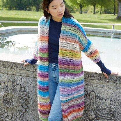 Lang PTO45-07 Cardigan is a lovely longline open-front woman's sweater knit in Cloud. The cardigan features a very relaxed fit with dropped shoulders, and three-quarter sleeves in an all-over drop stitch pattern. The sweater is knit flat in pieces from the bottom up and then seamed. Cloud by Lang Yarns is a light, and airy bulky weight, blown yarn. The colorful striping gives any garment a wow factor that looks impressive. The drop stitch pattern is in written form only.