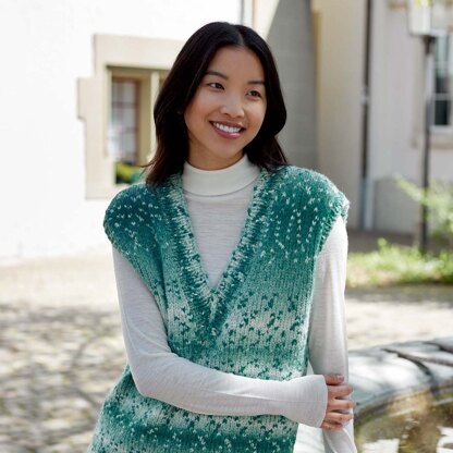 Lang PTO47-01 Vest is a women’s V-neck longline tunic knit in Snowflake. The vest is knit flat in pieces from the bottom up and then seamed. The neckband stitches are picked up along the neck edge and worked in the round. Snowflake by Lang Yarns has the same fluffy and light texture as a real snowflake! This yarn uses a special spinning process to create fun and unique color patterning.