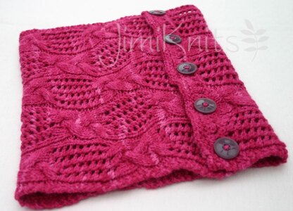 An elegant cowl with intricate cables and lacework, Langbrook is an ideal accessory to finish off any outfit. It is knitted flat from side to side and is finished off with button detailing that can be worn fastened any way you like.