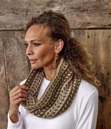 Lara cowl is knitted in the round on circular needles, using simple stranded colourwork suitable for beginners. Working in the round forms a tube (the circumference of the cowl), then the cast-on and cast-off edges are joined once you have finished knitting. This creates the cowl’s double thickness for extra warmth – with no ‘wrong side’ showing!
