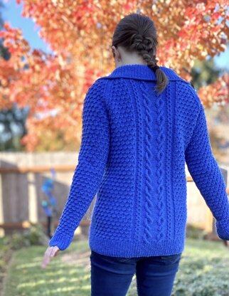 This sweater coat is all about the texture! Simple modern cables march up the fronts and center back while the sides and sleeves feature a wonderfully squishy, easy to work texture pattern. A wide, face-framing collar and generous front bands add warmth and style.