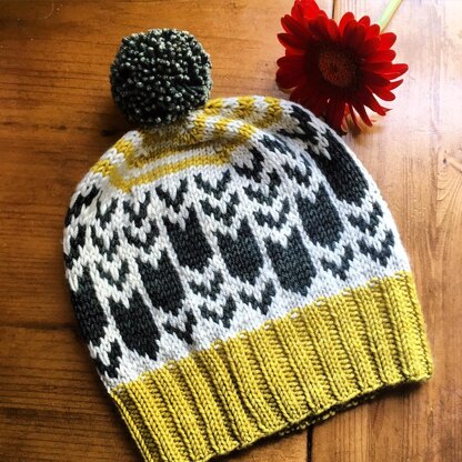 Yarn: Plucky Knitter Primo Aran (heavy worsted/75% merino/20% cashmere/ 5% nylon/ 200yds per skein) 1 skein each in Chamomile (color A) , Silver Lining (color B), and Kraken (color C). (uses approx 75 yards of each color for entire hat, including pompon)