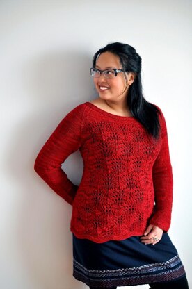 Levina is a comfortable and feminine pullover, worked in a peekaboo all-over lace pattern. Ostrich Plumes lace is easy to work and knits up in a jiffy on larger needles. The gorgeous yarn is Jill Draper’s superwash merino, which is smooth, soft, and a joy to knit with (the colour is awesome too!). Levina is knit seamlessly from the bottom up, in the round, with raglan sleeves. The flattering ballet neck is lowered in the front using short rows, and the simple long sleeves are edged with deep garter stitch cuffs.