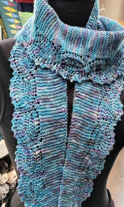 The concept for this scarf started with a gorgeous skein of yarn and the lace edging stitch pattern. Garter Stitch was added to give width. The scarf is worked tip to tip in one piece.