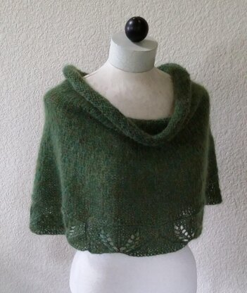 The Linda Marie knit in Cirrus is a light layer poncho. Great for a summer eve stroll or as an extra layer to ward off the chill from air conditioning. The rolled neck is shown in green and the funnel neck version in taupe.
